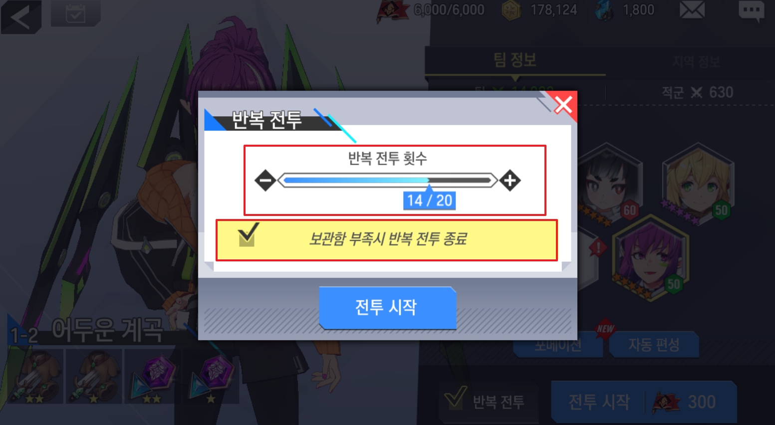 : ‘보관함 부족 시 반복 전투 종료’를 선택할 수 있습니다.