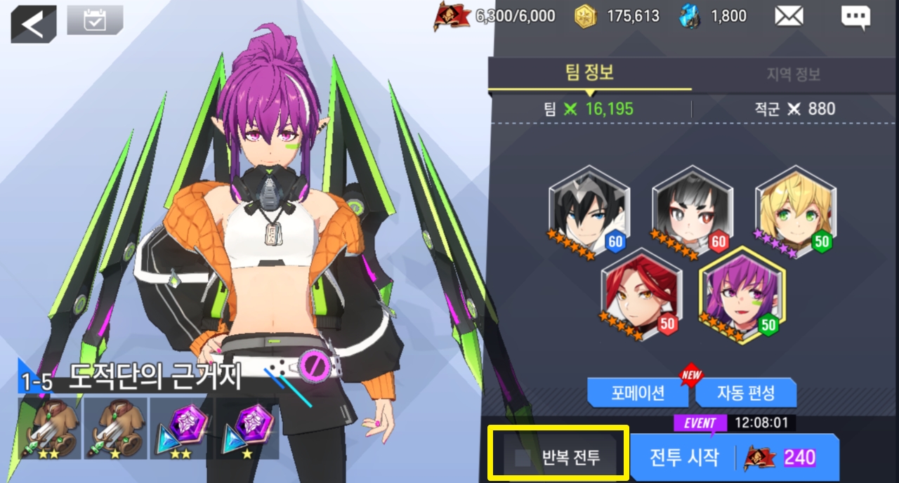 - 전투 입장 전 [반복 전투] 버튼을 클릭하여 설정이 가능합니다.