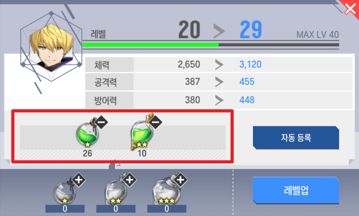- 경험의 파편을 종류별로 한 번에 사용할 수 있습니다.