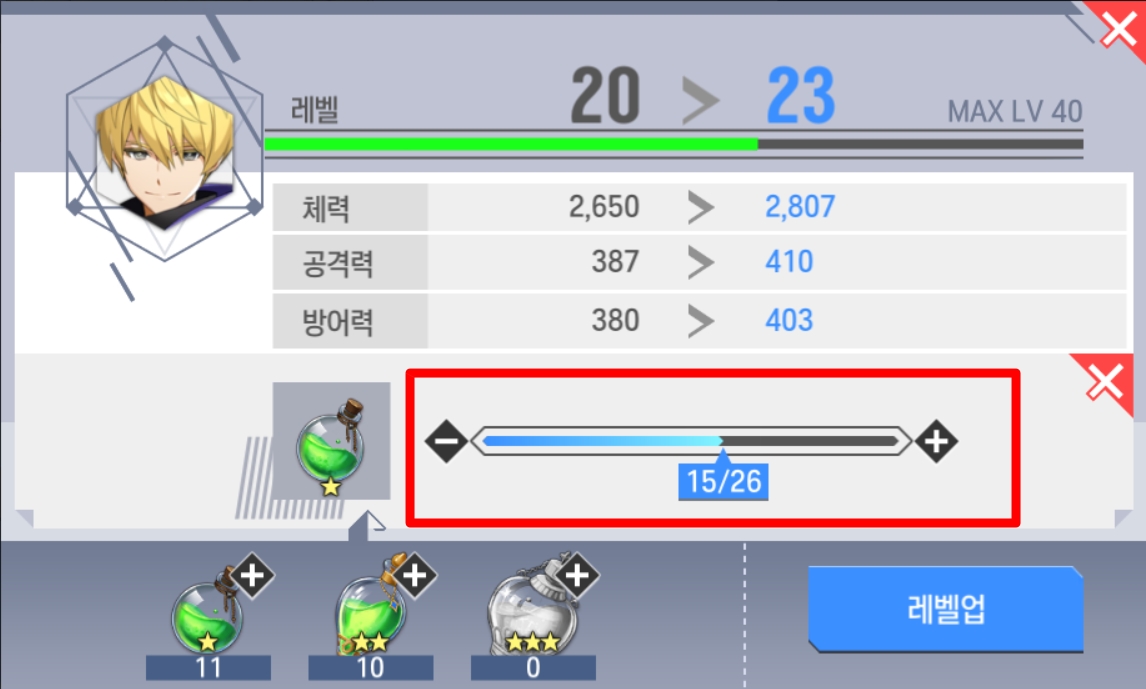 - 사용할 ‘경험의 파편’을 터치하면, 사용 개수를 직접 설정할 수 있습니다.