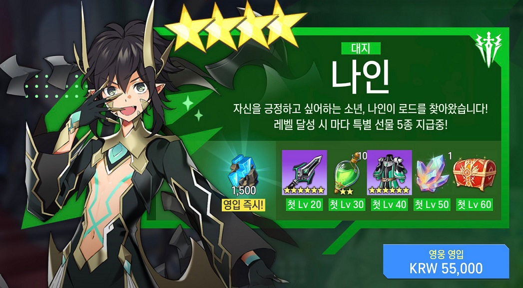 - 내용: 신규 영웅 [대지] 나인과 레벨 달성에 따른 특별 선물을 담고 있는 패키지