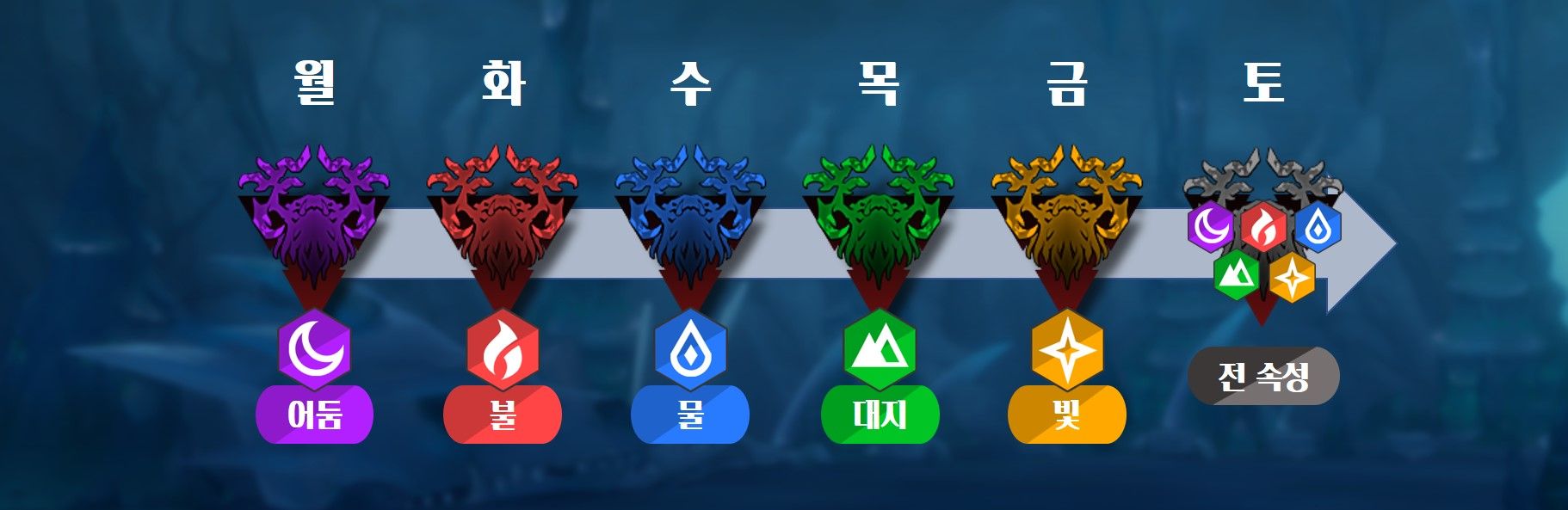 - 월요일부터 금요일까지 요일별로 고정된 속성의 균열의 괴수가 등장하며, 토요일은 어둠 속성부터 순차적으로 다른 속성 괴수가 번갈아 가며 나오게 됩니다.