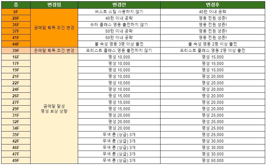 ▶ 오벨리스크 각 층의 메달 획득 조건 일부가 완화되며 금메달 달성 시 획득하는 명성도 상향됩니다