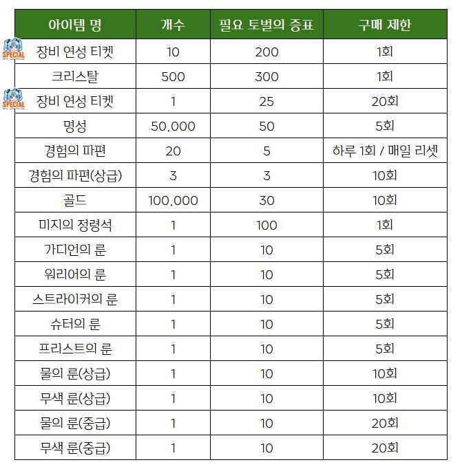 - ‘토벌의 증표[그론달]’을 사용하여 ‘특별 상점’에서 다양한 아이템으로 교환할 수 있습니다.