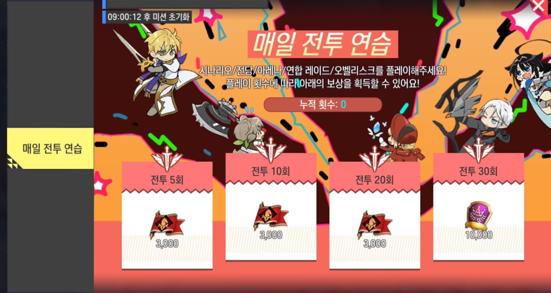 - 내용: 시나리오/전당/아레나/연합 레이드/오벨리스크를 플레이하고 보상을 받으세요!