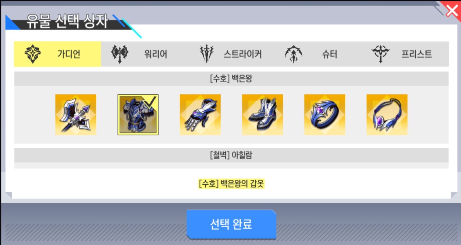 > [유물 선택 상자]: 클래스와 유물 1개를 선택하여 획득 가능한 상자