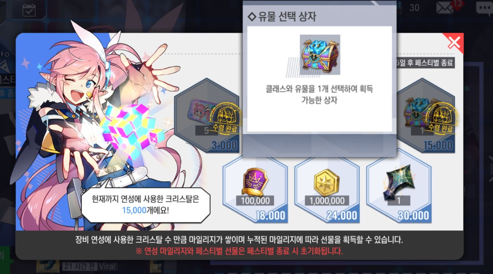 “연성에 사용한 크리스탈을 누적하여 다양하고 특별한 보상을 받아보세요!”