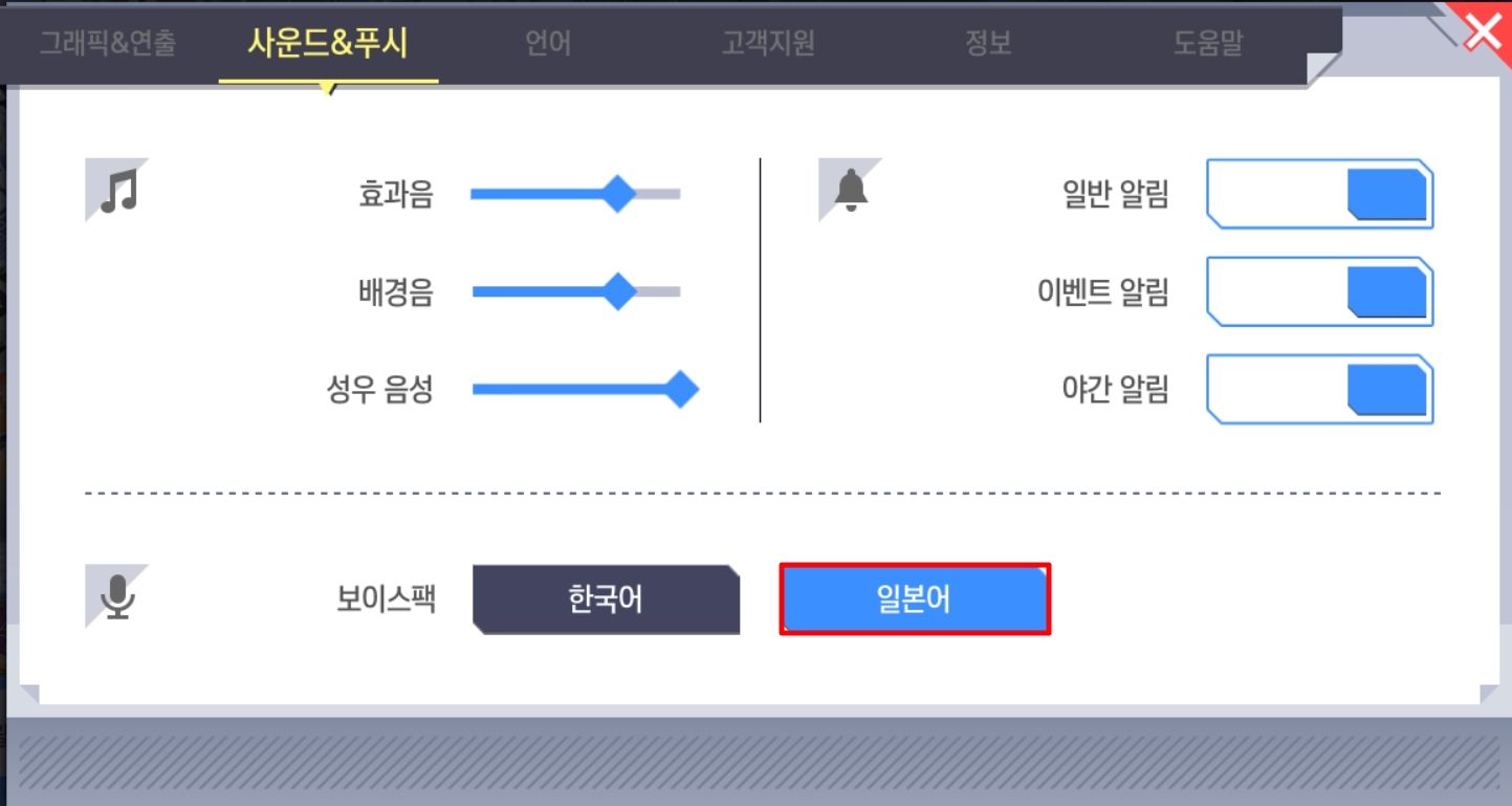 - 게임 [설정]-[사운드&푸시] 항목에서 일본어 보이스 팩이 선택 가능해집니다.