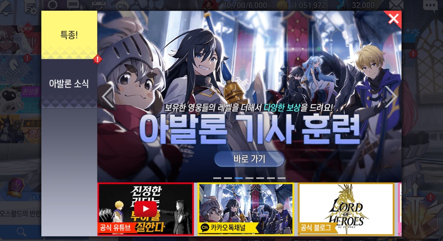 > 게임 로그인 시 팝업창이 출력되어 아발론의 주요 소식을 클릭해서 볼 수 있습니다