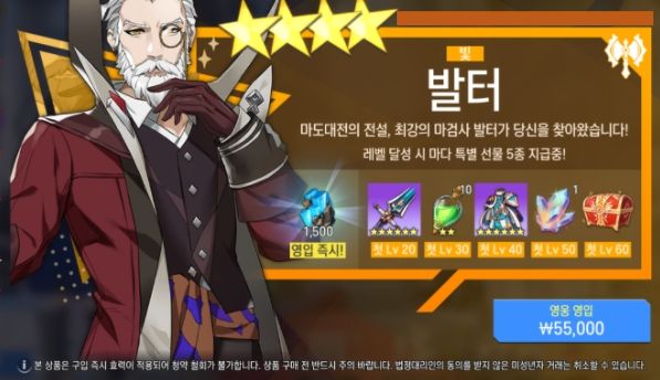 - 내용 : 신규 영웅 [빛] 발터와 레벨 달성에 따른 특별 선물을 담고 있는 패키지.