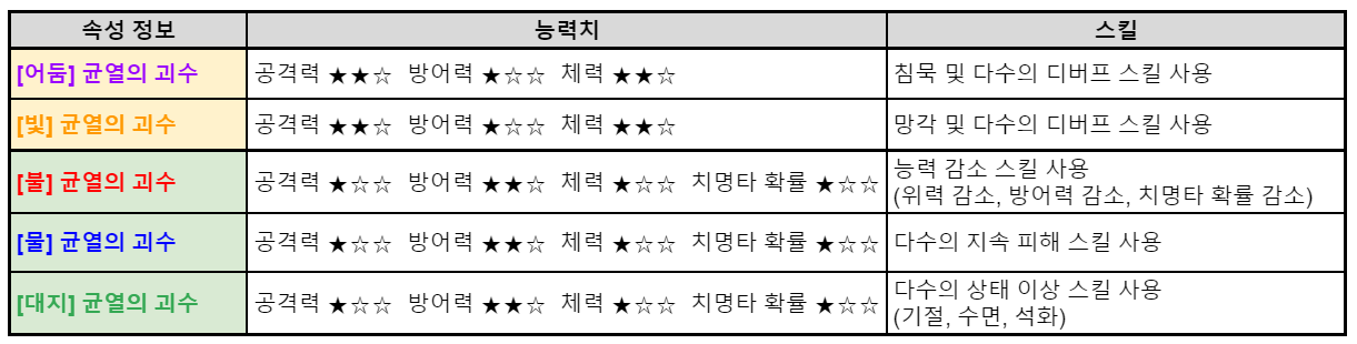 [균열의 괴수 속성 별 특징]