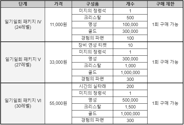 - 일기일회 패키지의 마지막 단계와 레벨이 같거나, 마지막 단계보다 높으면 로비 최초 접속 시 패키지 상품이 노출됩니다.