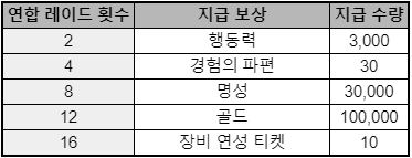 - 연합 레이드 플레이 횟수에 따라 보상을 획득할 수 있습니다.