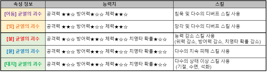 - 보스 스킬: 보스의 턴 마다 공격력이 증가합니다. 이 효과는 중첩되며 턴이 증가 할 때마다 수치가 증가합니다.