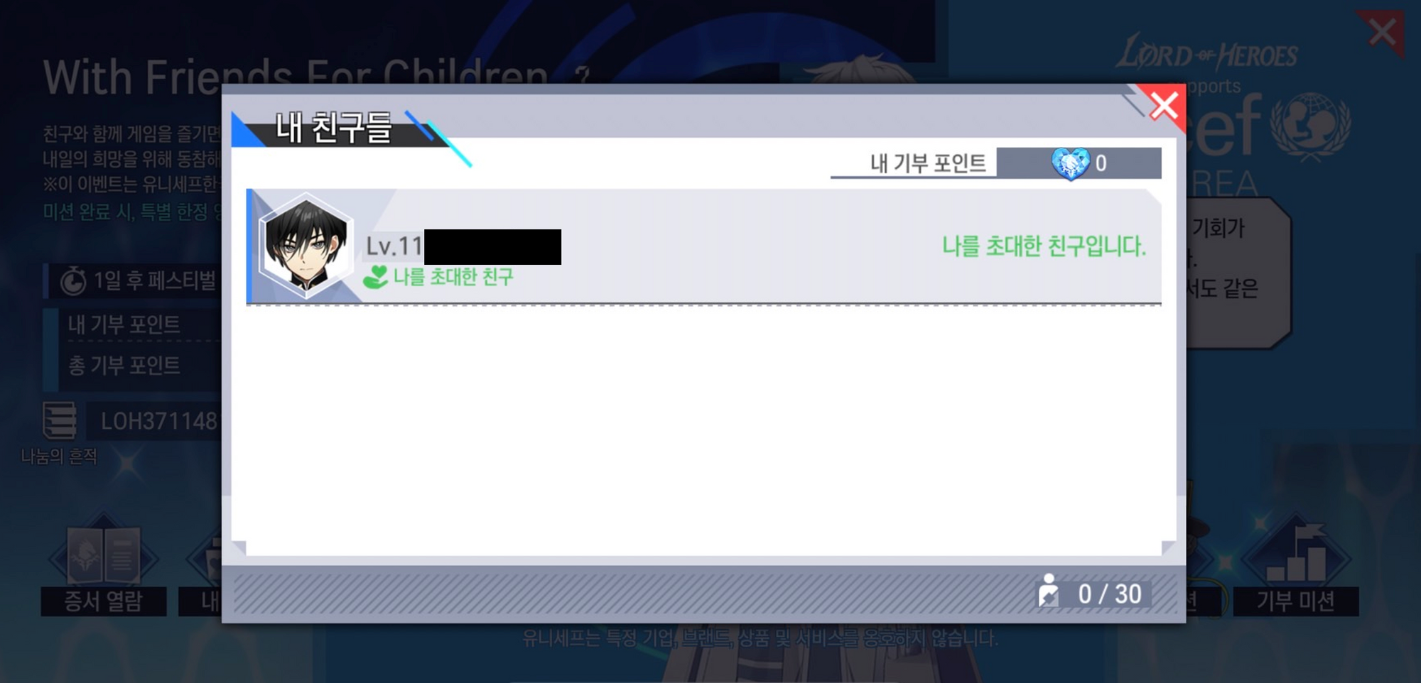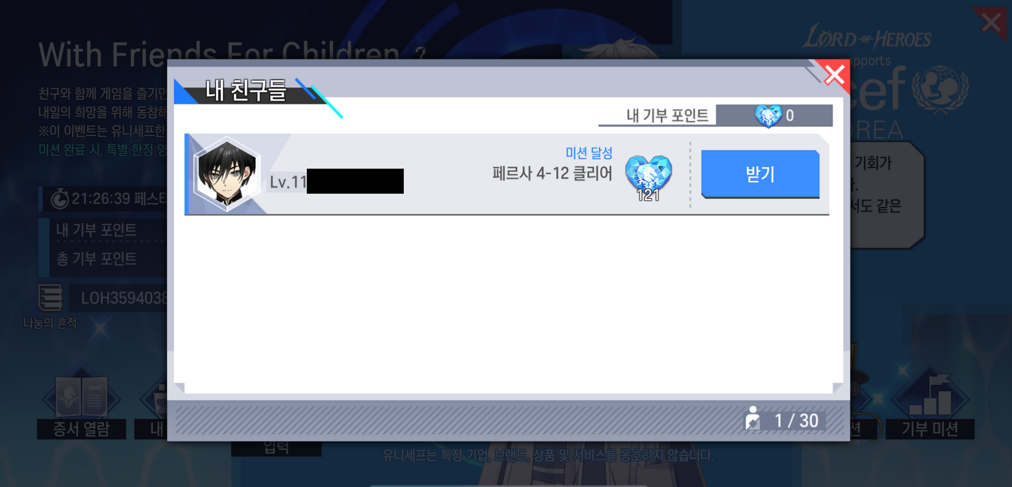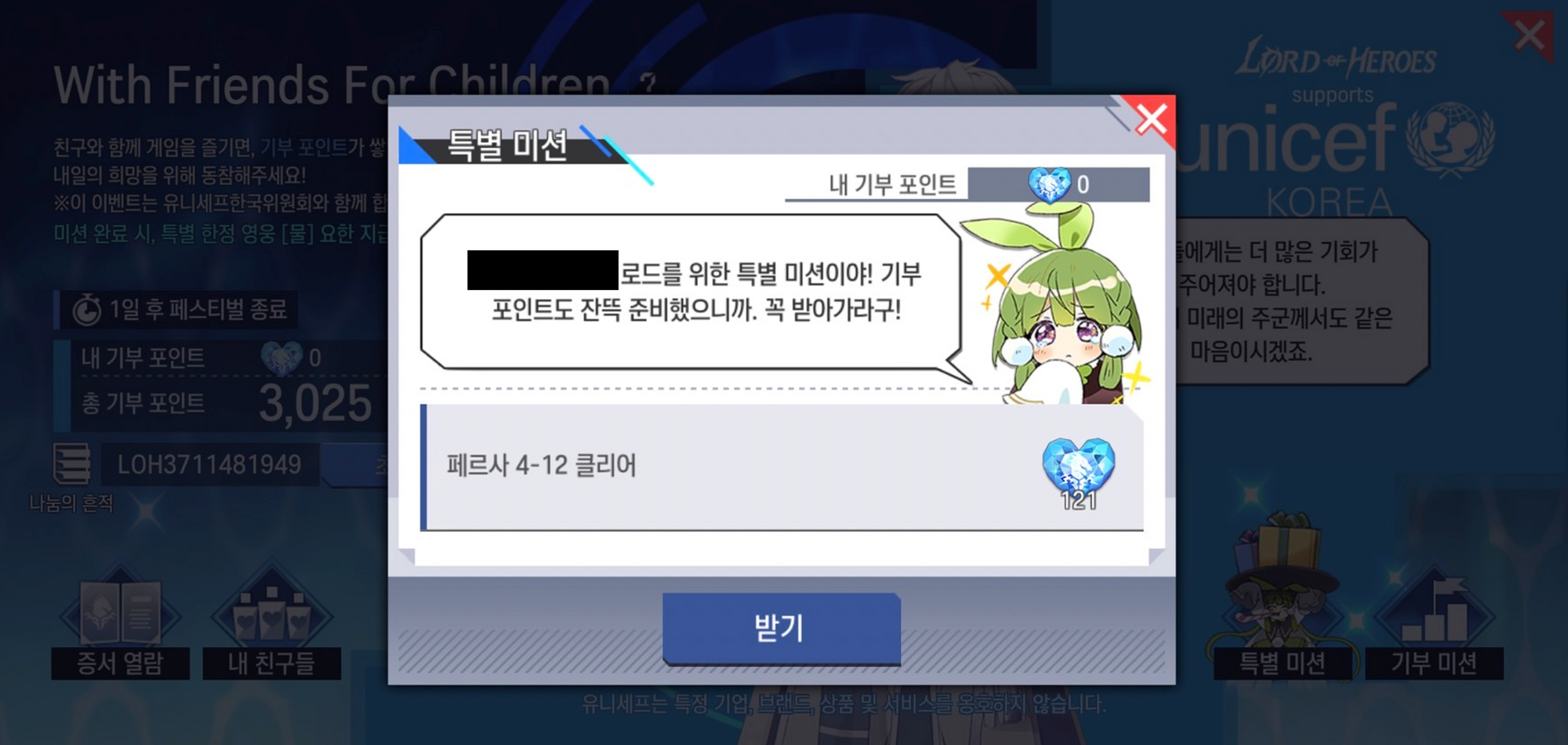 - 특별 미션 진행이 불가능한 초대자 로드님 및 이미 특별 미션을 완료 하신 신규/복귀 로드님께서는, 자신의 초대 코드를 입력한 친구 로드님께서 ‘[노말] 페르사 4-12’ 스테이지를 클리어하실 경우 [내 친구들] 목록을 통해 121 기부 포인트를 획득 할 수 있습니다.