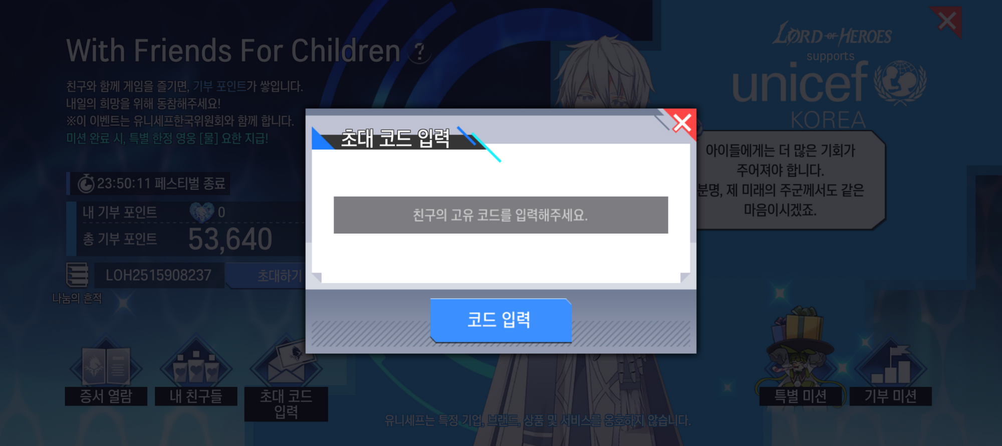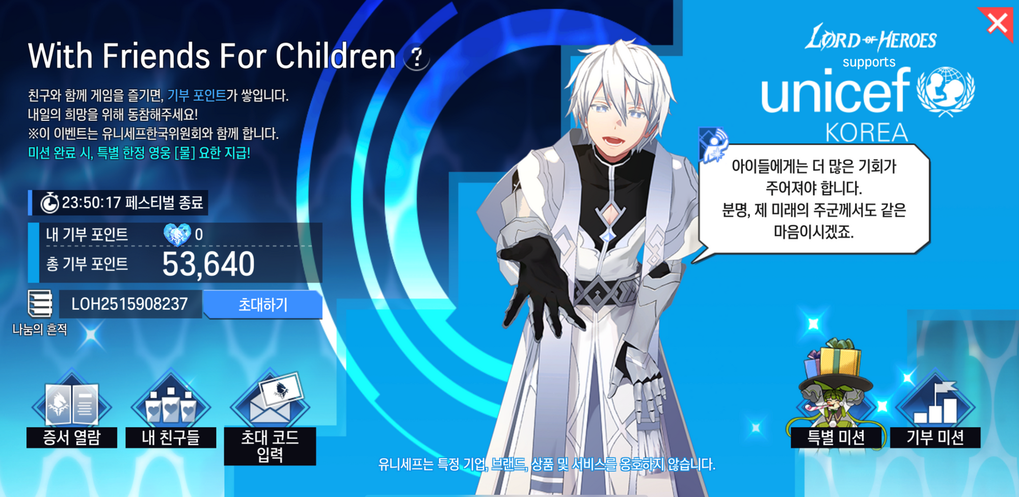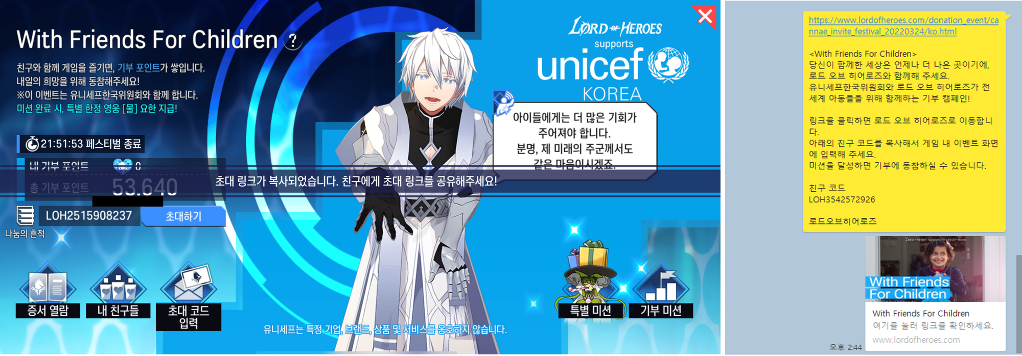 - 유니세프한국위원회와 함께하는 기부 이벤트, 친구 초대 페스티벌이 시작됩니다.