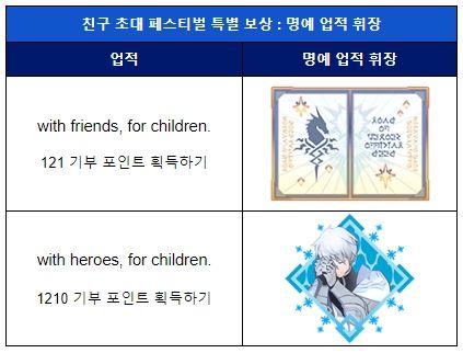 - 획득한 기부 포인트에 따라 친구 초대 페스티벌 업적을 달성할 수 있으며, 업적 달성 시 명예 업적 휘장을 획득할 수 있습니다.