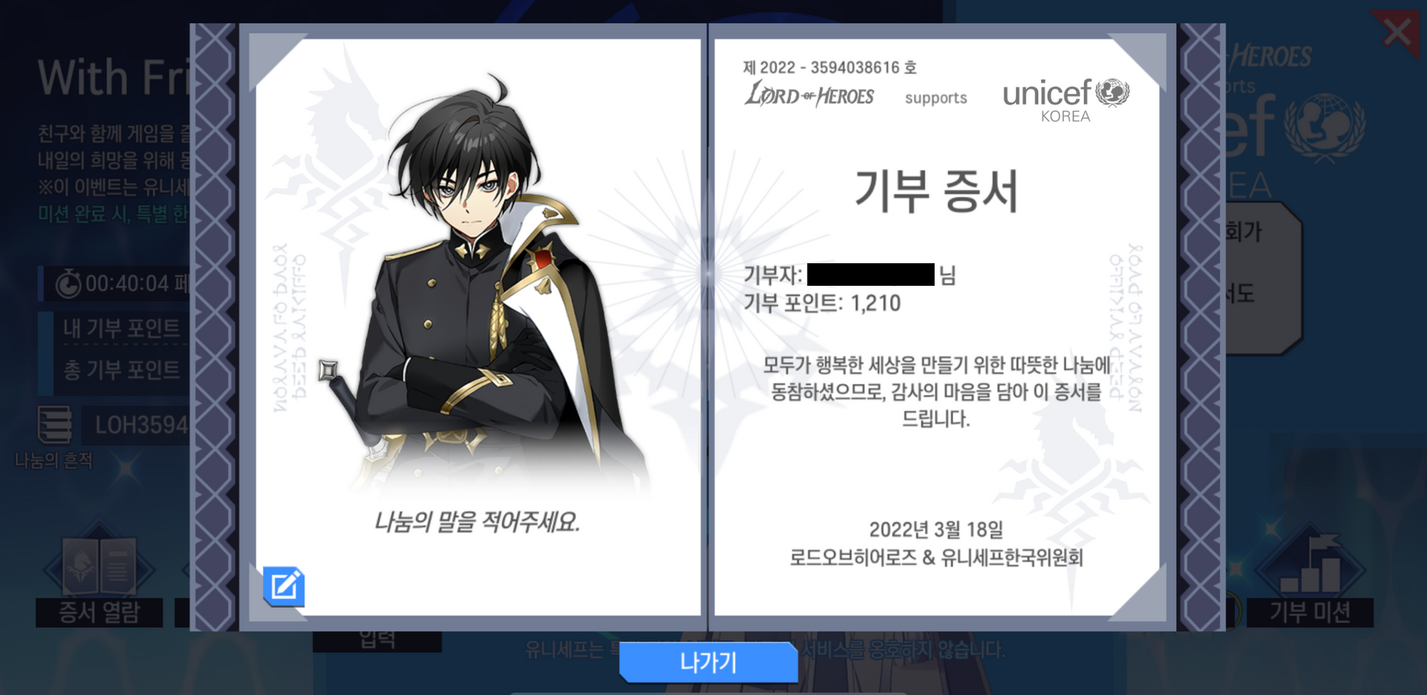 - 친구 초대 페스티벌에서 기부 포인트를 1,210 이상 획득하신 로드님은 기부 증서 발급을 진행하실 수 있습니다.