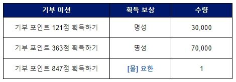 - 획득한 기부 포인트에 따라 [기부 미션]이 완료되며, 완료된 기부 미션 단계마다 보상을 획득할 수 있습니다.