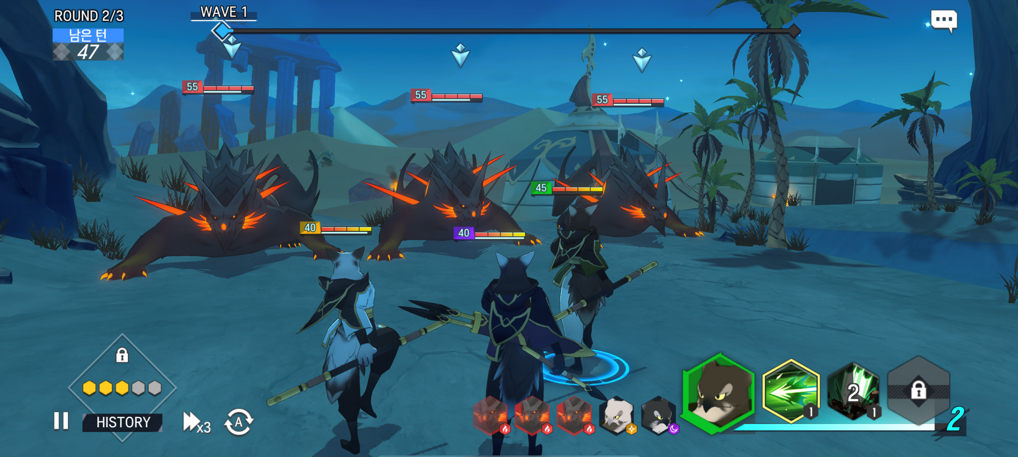 - 웨이브 전투는 한 라운드 내에 다수 발생할 수 있으며, 모든 웨이브를 완료해야해당 라운드를 마무리할 수 있습니다.