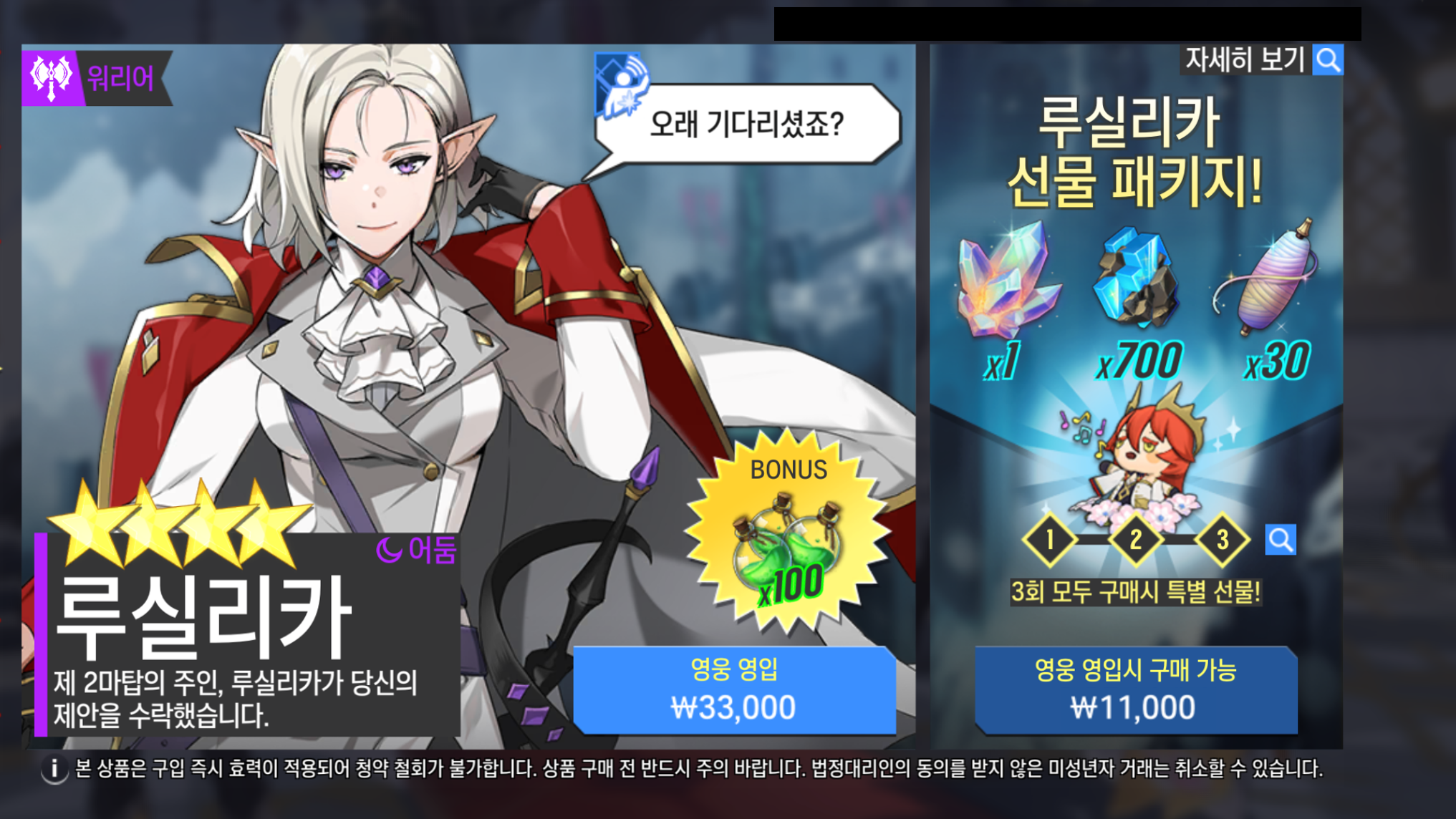 - [어둠] 루실리카는 신규 영웅 패키지 구매로 영입이 가능합니다.