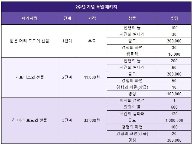 ※ 2주년 기념특별 패키지는 각 선행 단계 패키지를 우선 구매하여야 다음 단계를 구매할 수 있습니다.