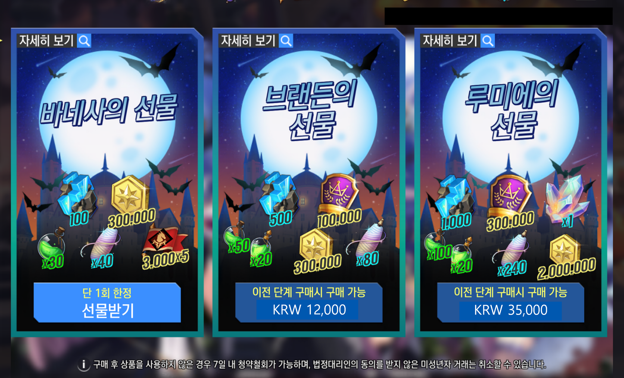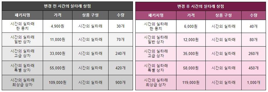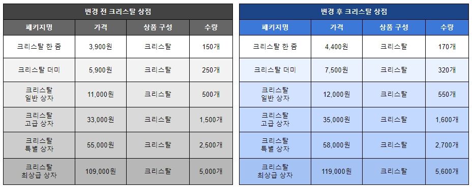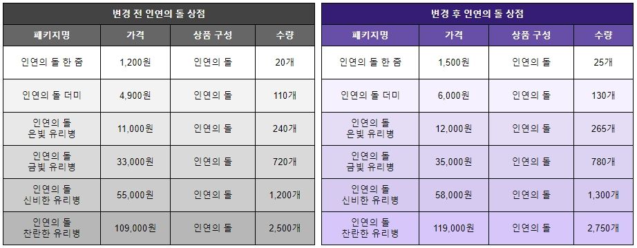 ※ 변경된 상품 가격 및 패키지 내 재화의 수량은 10/6(목) 업데이트 이후 반영되는 점 참고하셔서 구매 시 불편함이 없으시길 바랍니다.