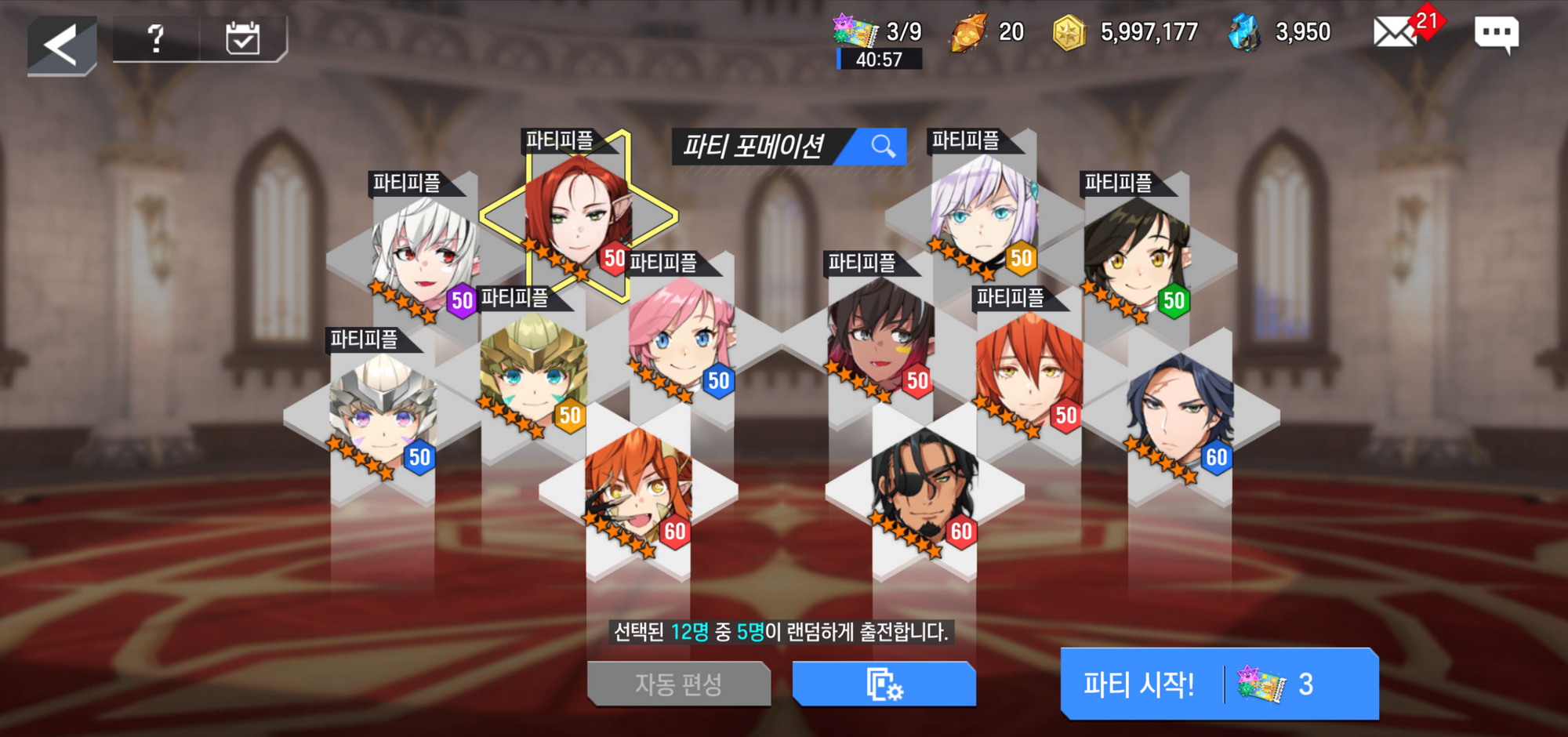: 시즌 파티 전용 포메이션으로 총 12명의 영웅을 초대할 수 있지만, 실제 전투는 이중 랜덤하게 선정된 5명이 치르게 됩니다. 경계면에 진입한 5명의 영웅들은 기본 공격과 액티브 스킬만을 사용하여 빠르게 전투를 진행합니다.