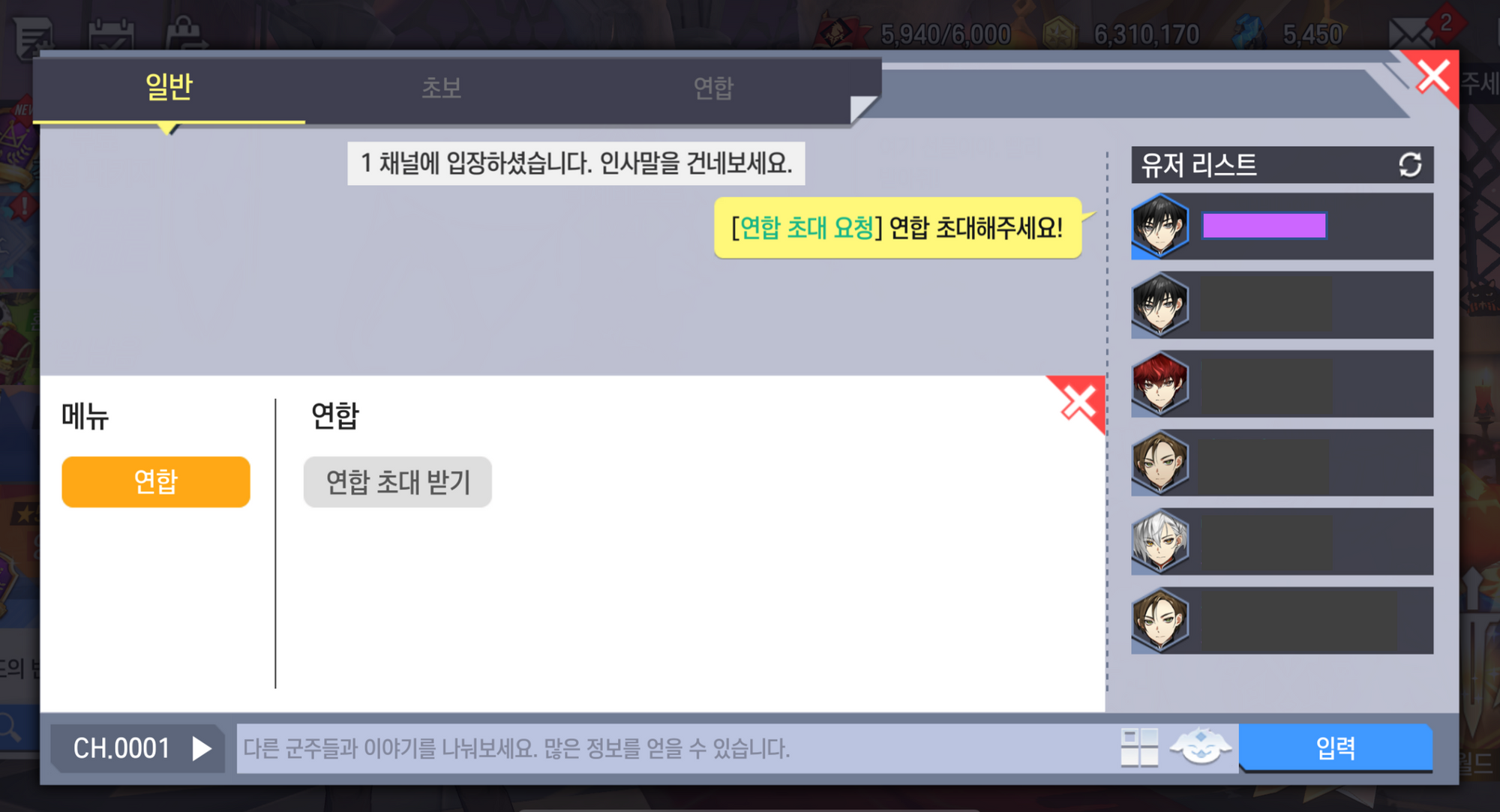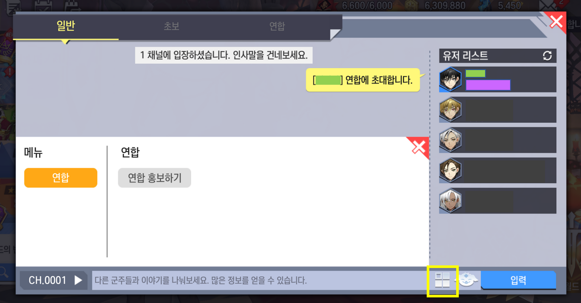- [연합 초대 받기] 기능은 채팅 입력창 우측 버튼을 통해 이용할 수 있습니다.