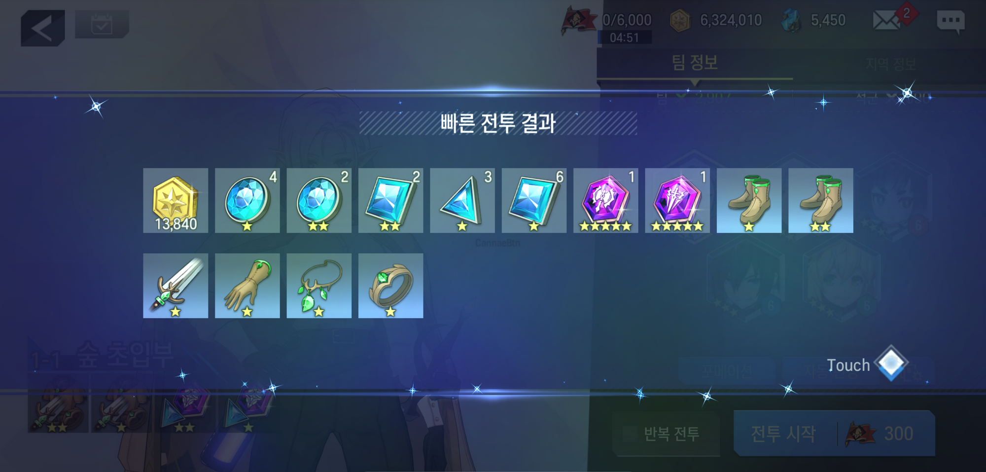 - 빠른 전투 진행 즉시, 경험치를 획득하는 영웅들의 정보와 빠른 전투 결과로 획득된 아이템을 확인할 수 있습니다.