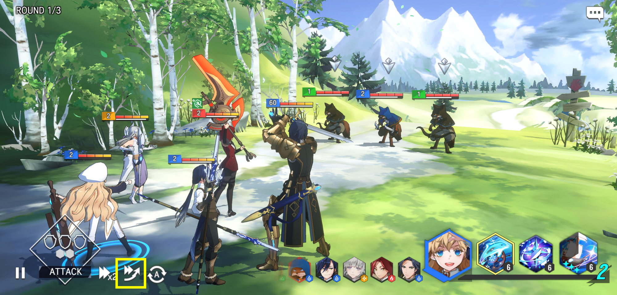 - ‘전투 속도 증가’ 버튼은 전투 중 좌측 하단 버튼을 통해 활성화 할 수 있으며, 활성화 시 기존보다 더 빨라진 속도로 게임을 이용할 수 있습니다.