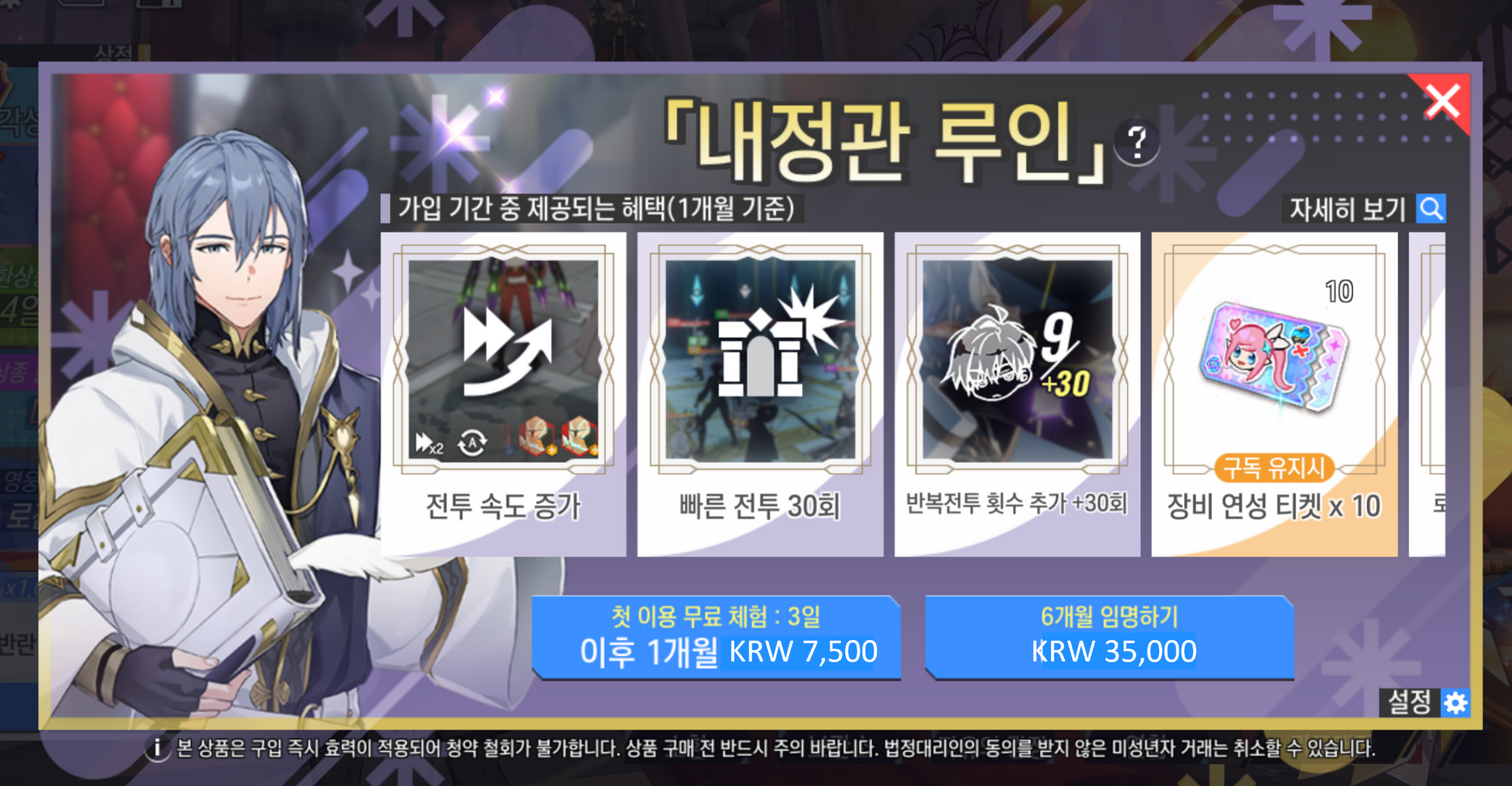 ※ ‘내정관 루인’은 매월 자동 결제되는 구독 상품으로 1개월 구독 서비스 가입 시 3일간 무료로 혜택을 이용할 수 있으며, 무료 혜택 이용기간 종료 후 구독을 가입한 스토어 결제 방식으로 구독 서비스에 대한 결제가 청구됩니다.