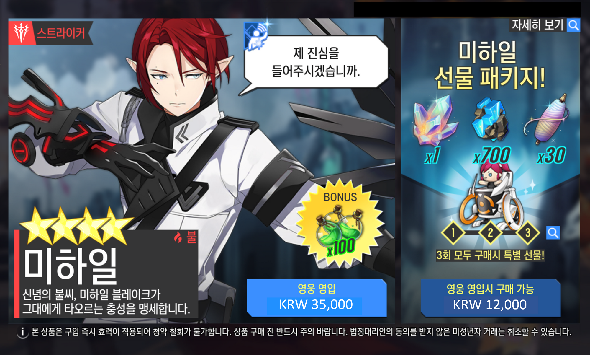1. 유료 캐릭터 패키지: [불] 미하일 (스트라이커) 판매
