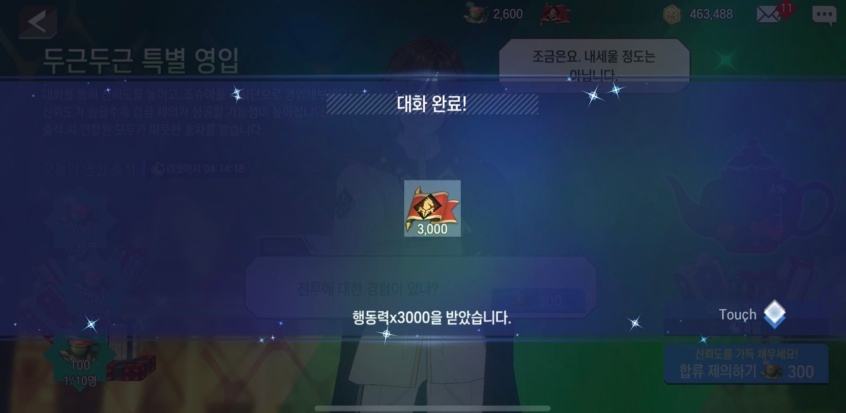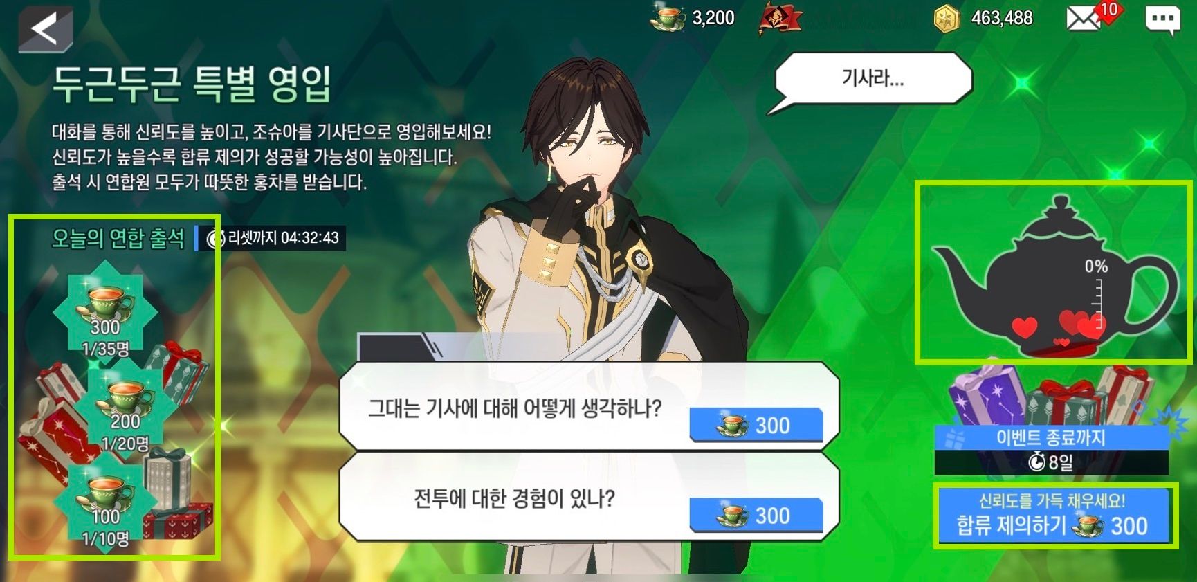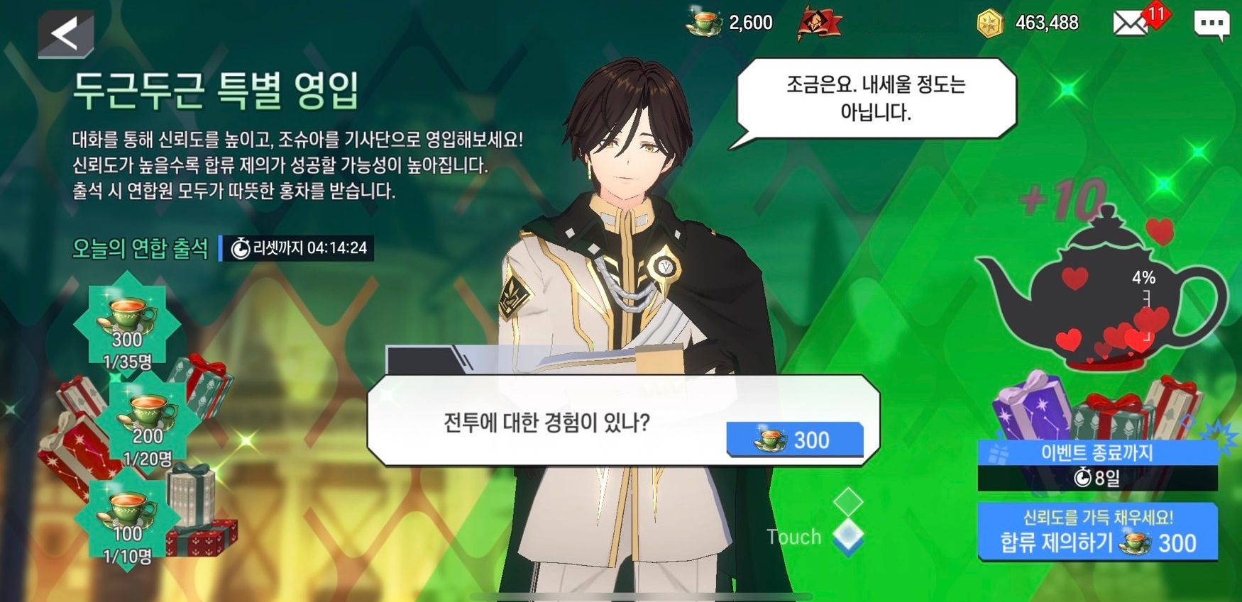 - [두근두근 특별 영입] 화면에 진입하면 매일 출석을 통해 ‘따뜻한 홍차’를 획득할 수 있습니다. 또한, 연합원들에게도 선물로 일정 개수의 ‘따뜻한 홍차’가 지급됩니다.