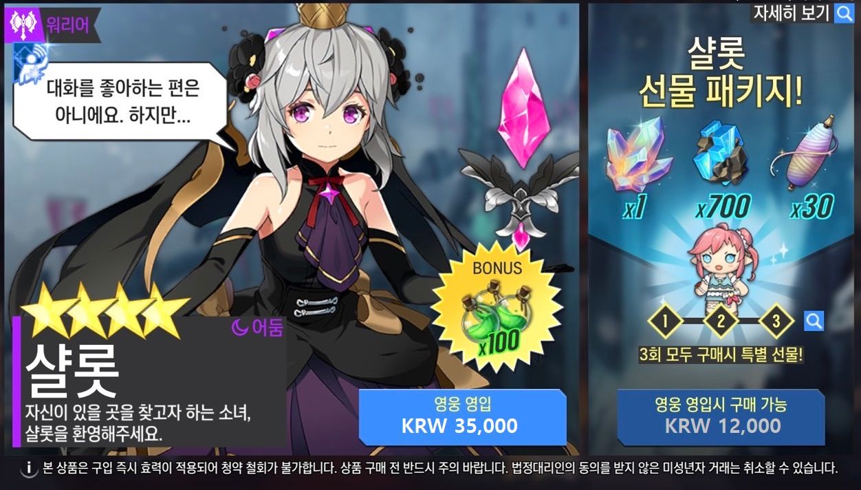 - 신규 영웅 패키지 [어둠] 샬롯 영입 후 구매할 수 있는 상품입니다.