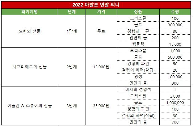 ※ ‘2022 아발론 연말 파티’ 패키지는 각 선행 단계 패키지를 구매해야 다음 단계를 구매할 수 있습니다.