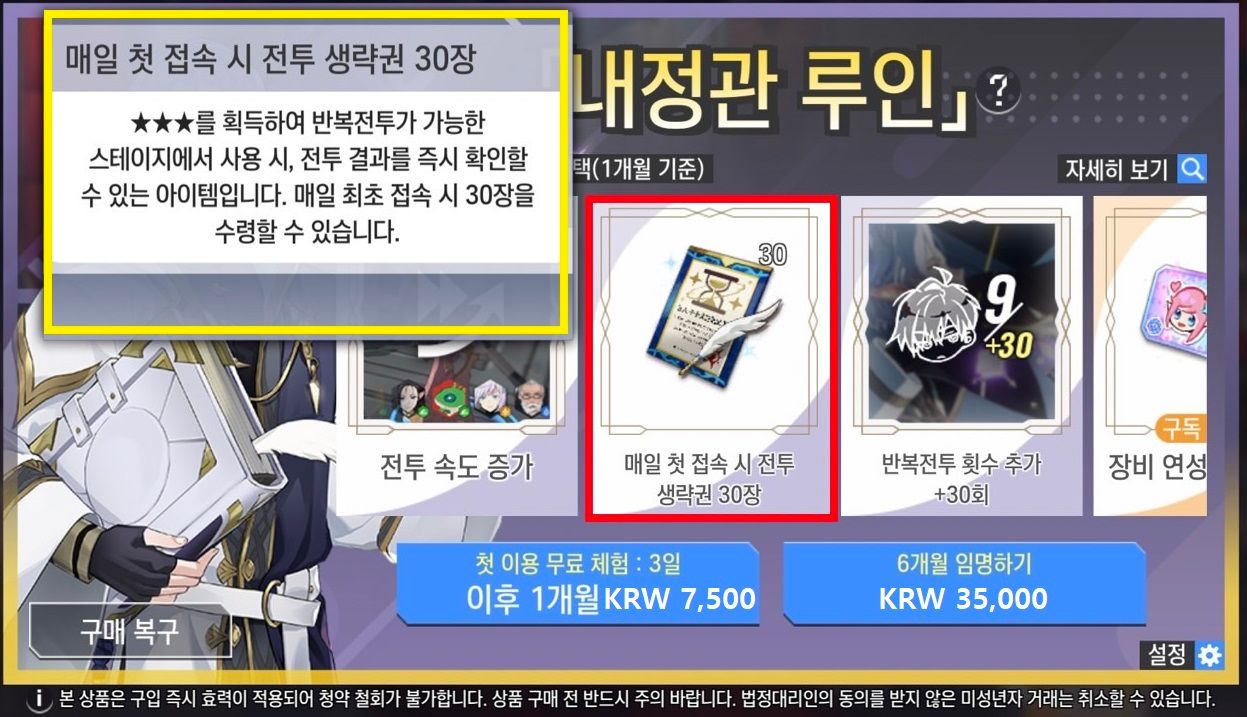 → 변경 : 매일 접속 시 (0시 기준) ‘전투 생략권 30개’ 우편 지급.