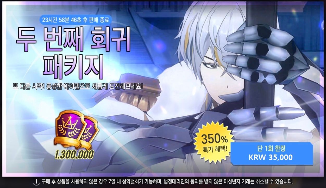 ※ 두 번째 회귀 패키지 구매 시 [명성] 1,300,000개를 획득할 수 있습니다.