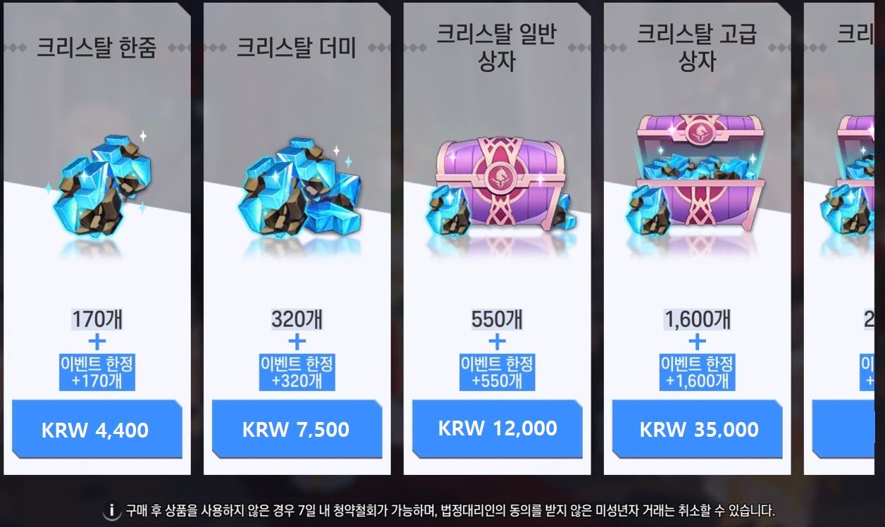 ※ 1+1 혜택 상품의 청약 철회 시에는 추가 지급된 크리스탈을 보유하고 있어야 청약철회가 가능합니다.