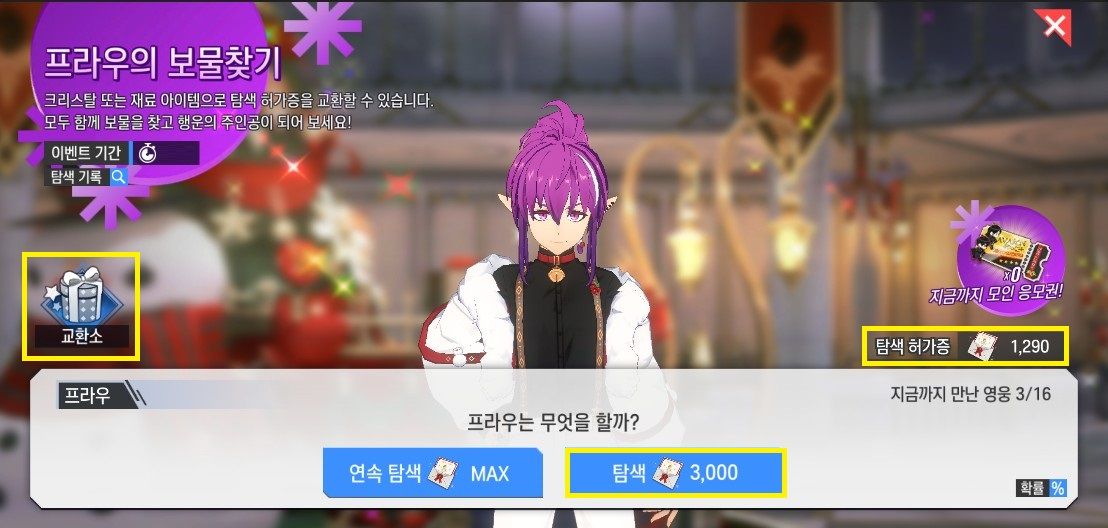 프라우와 함께 사용하지 않는 재화를 소모해서 특별한 보물을 찾아보세요!