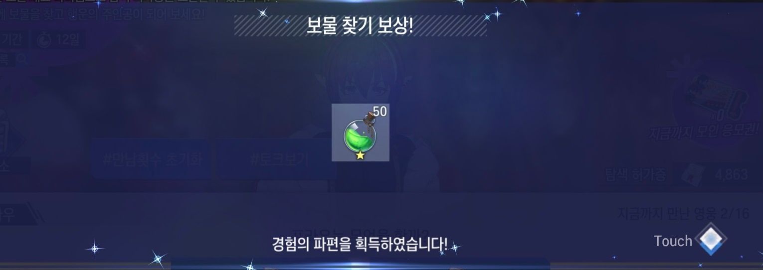 - 영웅을 만나서 대화를 완료하면 보물을 획득할 수 있습니다.