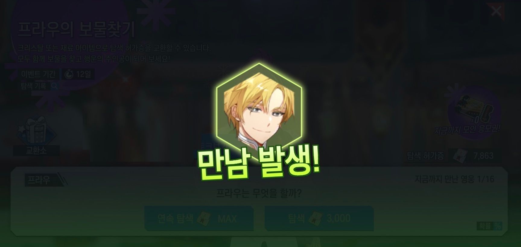 - [탐색]을 선택하면 프라우가 외출을 하며 무작위로 영웅을 만나게 됩니다.