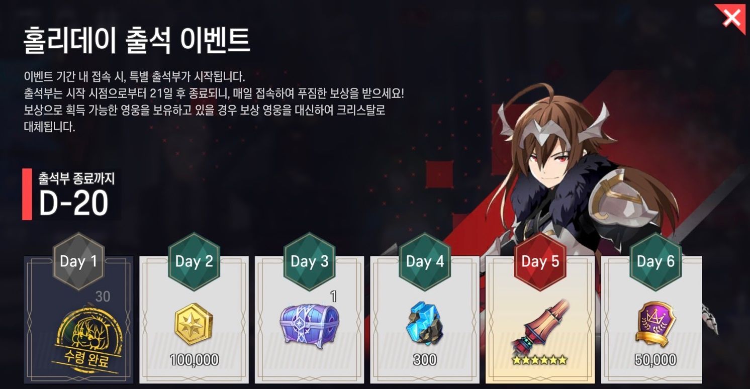 - 활성화된 이벤트 출석부는 첫 활성화 날짜를 기준으로 최대 21일동안 진행됩니다.