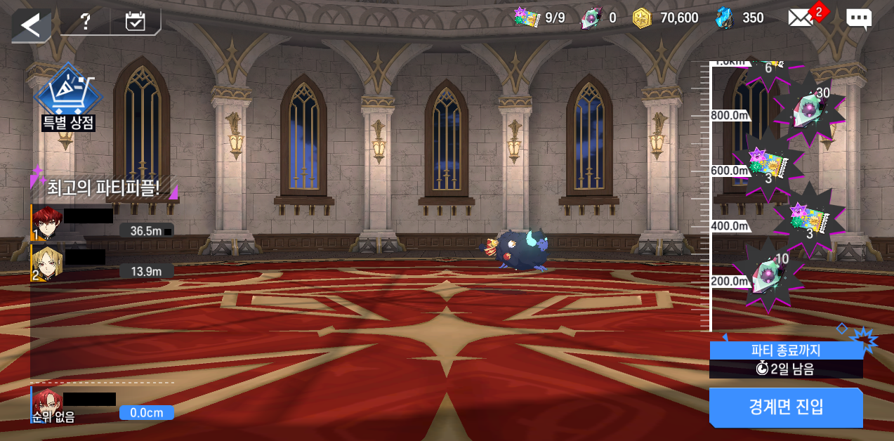 - 파티 입장권은 최대 9개까지 자동으로 충전 가능하며, 9개 미만일 경우 시간이 경과함에 따라 자동으로 충전됩니다. 입장권이 9개 혹은 그 이상일 경우, 자동으로 충전되지 않습니다!