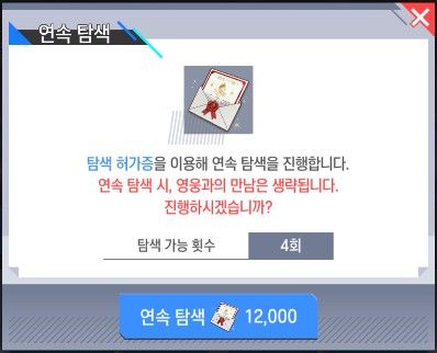 - [연속 탐색] 선택 시, 보유하고 있는 탐색 허가증을 모두 소모하여 보물을 즉시 획득할 수 있습니다.