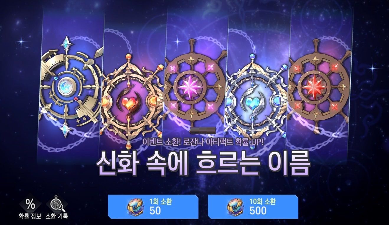 ※ 신화 속에 흐르는 이름의 각 아티팩트 확률은 게임 내 [소환 > 신화 속에 흐르는 이름 > 확률 정보%]에서 확인할 수 있습니다.