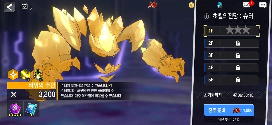 - 각 층은 하루 최초 1회 클리어만 가능하며 클리어 횟수는 매일 00:00에 초기화됩니다.
