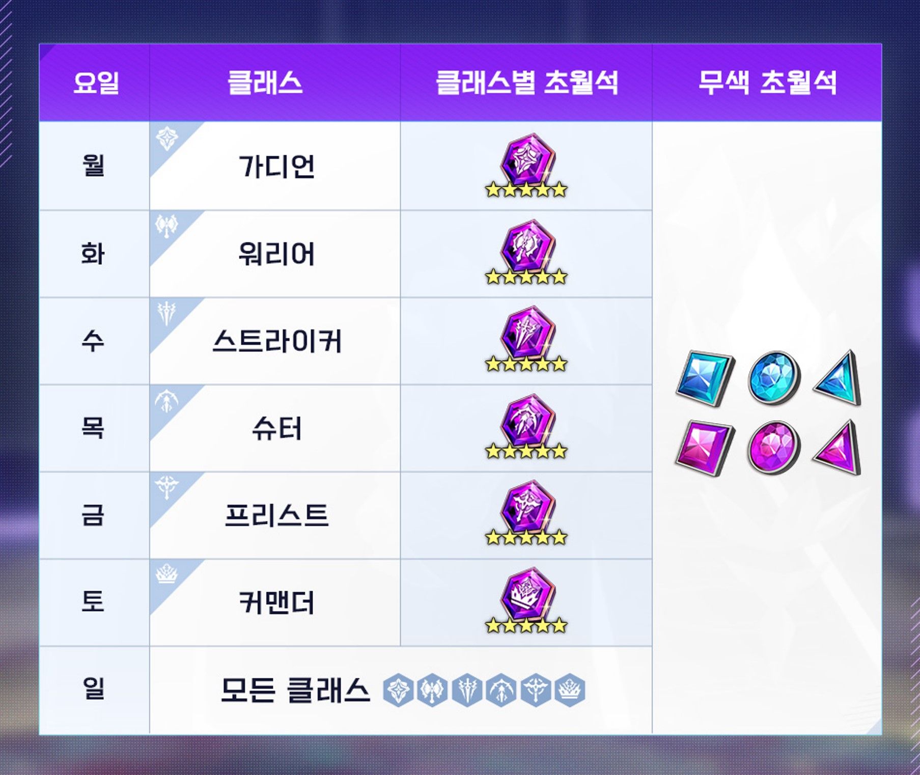 - [초월의 전당]은 요일마다 클래스가 변경되고, 일요일의 경우 모든 클래스의 초월석 중 1종을 확률에 따라 획득할 수 있습니다.