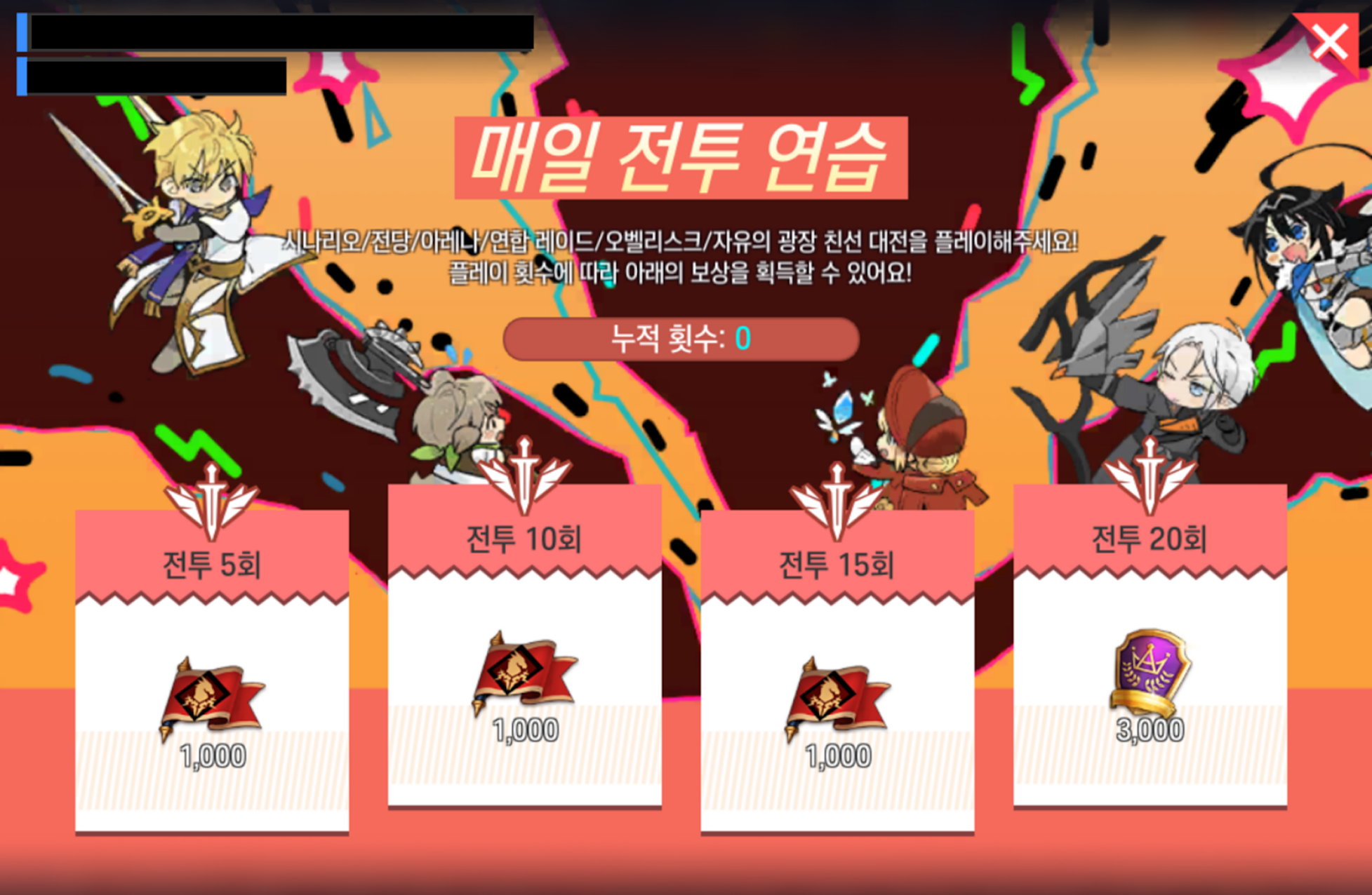 - 시나리오/ 전당 / 아레나 / 연합 레이드 / 오벨리스크 / 자유의 광장 친선대전 플레이 횟수에 따라 보상을 드립니다!
