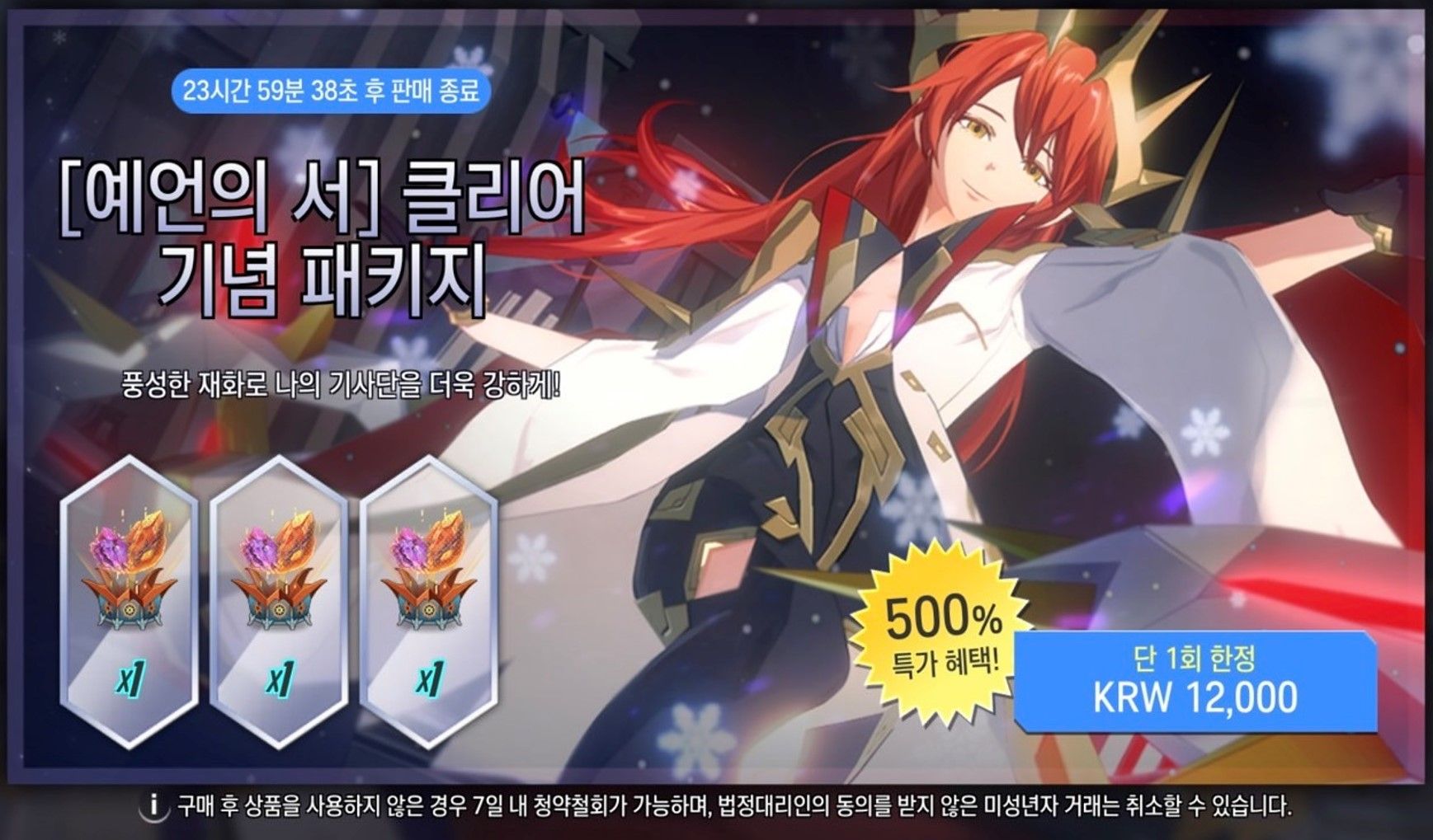 - 예언의 서 클리어 기념 패키지는 [예언의 서 - DAY 75. 21:59] 클리어 시 활성화 됩니다.